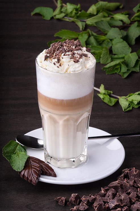 Latte Macchiato verfeinert mit belebender Minze und edel herber Schokolade, dazu ein knuspriges Topping.