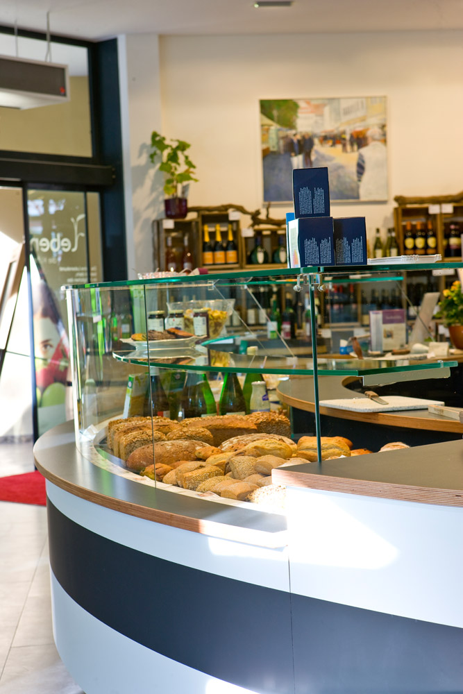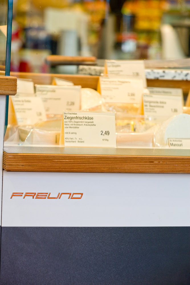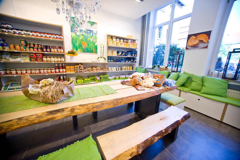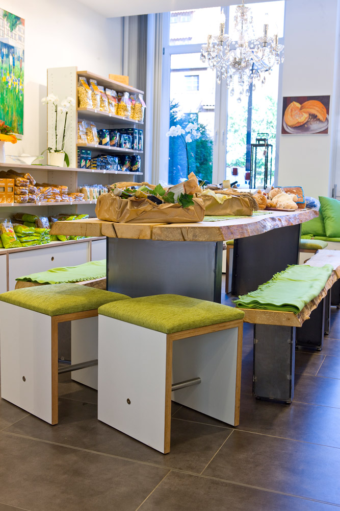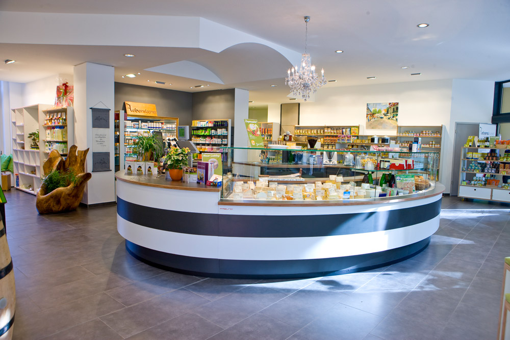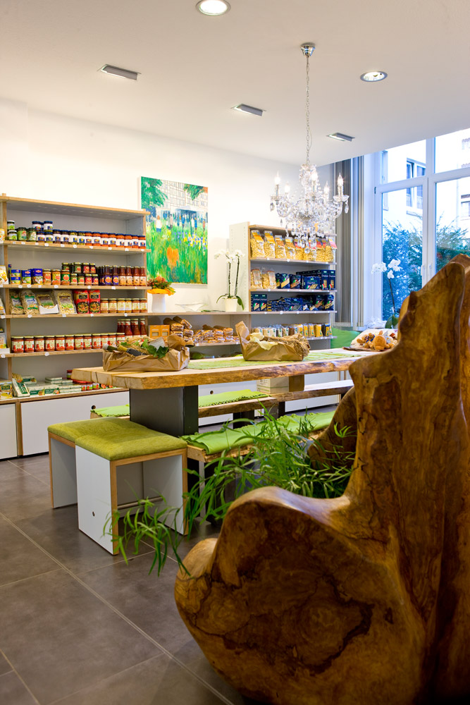 Die Farben Grün und Weiß, Farben der Lebensfreude, prägen den Raum im neueröffneten Markt. An dessen Eingang wird der Kunde durch eine repräsentative Rundtheke und zugleich dem „Herzstück“ des Ladens empfangen: die Bedienungsabteilung, mit frischen Backwaren und verschiedenen Frischeerzeugnissen. Besonders an dieser Abteilung wird deutlich, dass sich der Biogedanke und moderne Verkaufstechnik nicht ausschließen – ganz einfach, weil es dem Produkt und dem Empfinden des Kunden „gut tut“. Großzügig, mit hellen, modernen Regalsystemen wird der Kunde durch das gesamte weitere Sortiment geführt. Ein gemütlicher Cafébereich lädt die Kunden ein, bei einer Tasse Bio- Café von FREUND Coffee Basics zu verweilen.