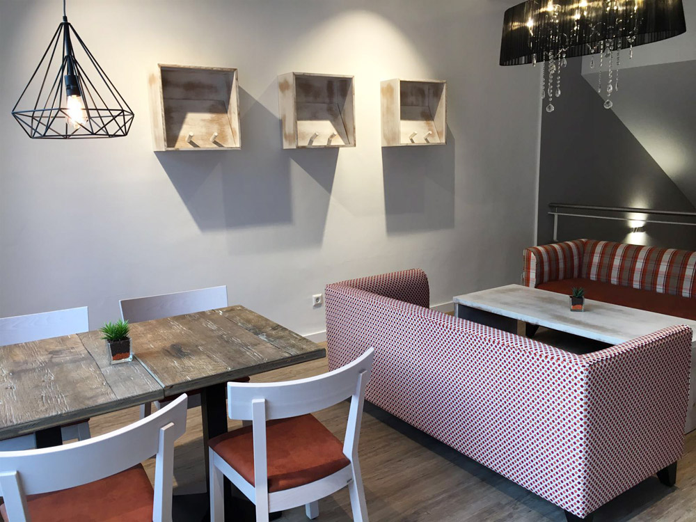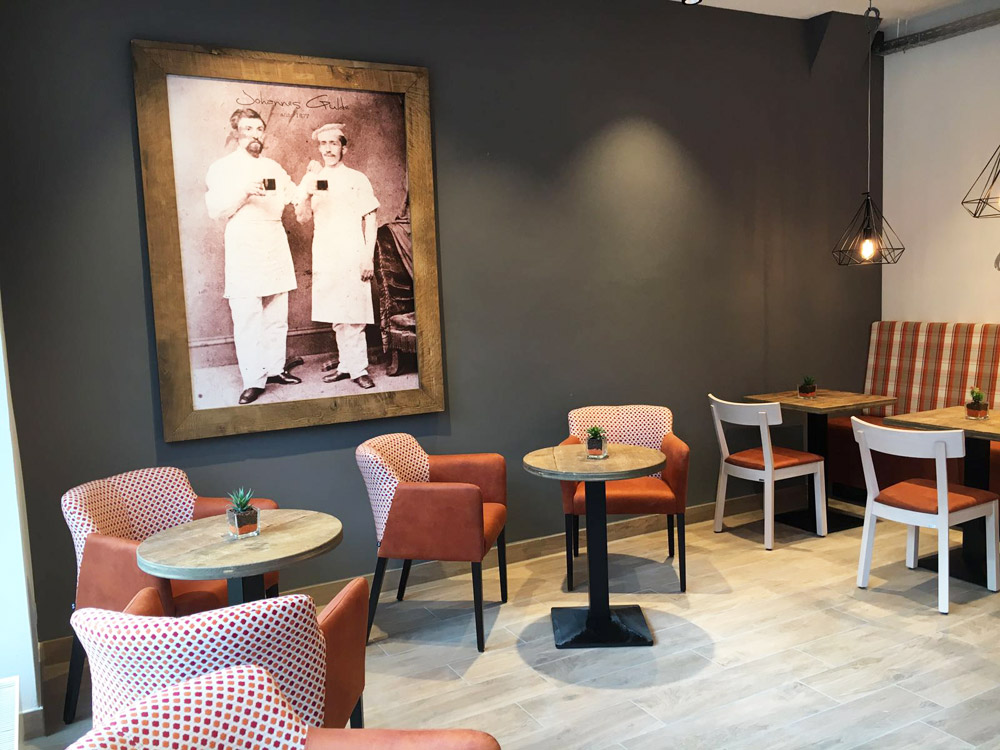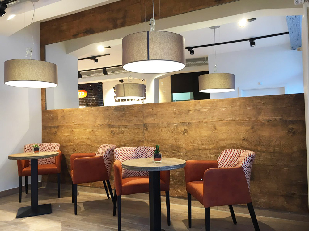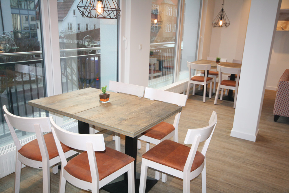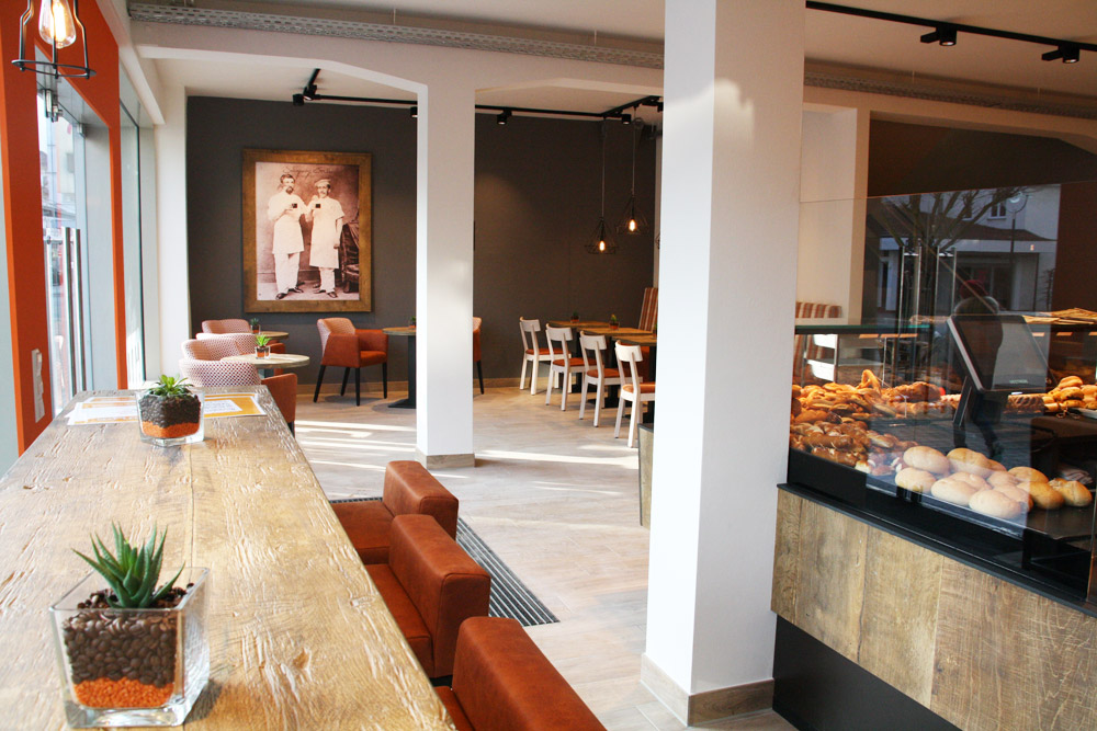 Bei der Gestaltung wurde viel Echtholz eingesetzt, ohne dabei den Raum zu überladen. In der geradlinigen Theke kommen die Backwaren hervorragend zur Geltung.
