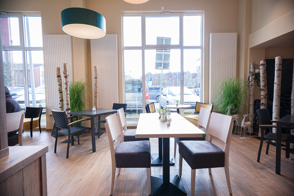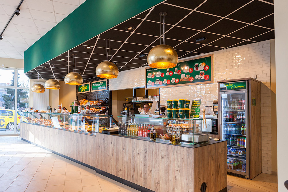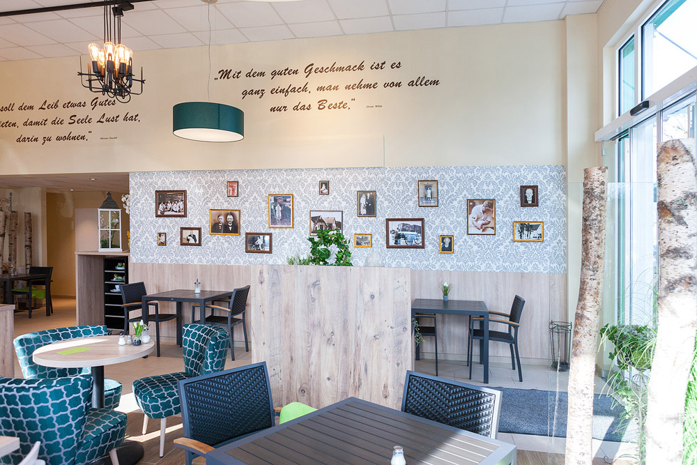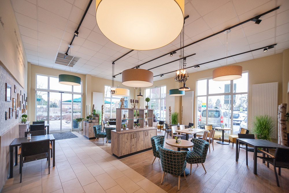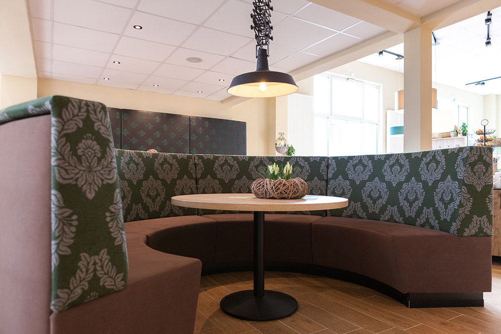 Bei der Gestaltung wurde die Firmenfarbe dunkelgrün mit Holzdekor kombiniert. Die gekonnte Farbkombination verleiht dem Raum eine gemütliche Atmosphäre mit edlem Charakter. Historische Bilder des Bäckermeisters Heinrich Tönjes, dem Gründer der Landbäckerei, spiegeln dabei die langjährige Familientradition wider.