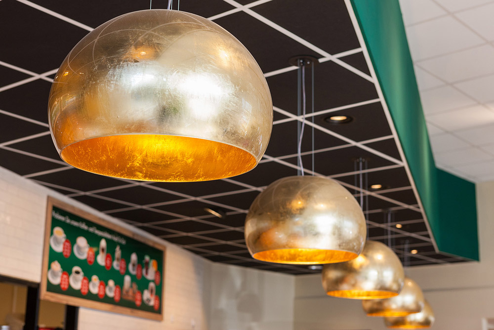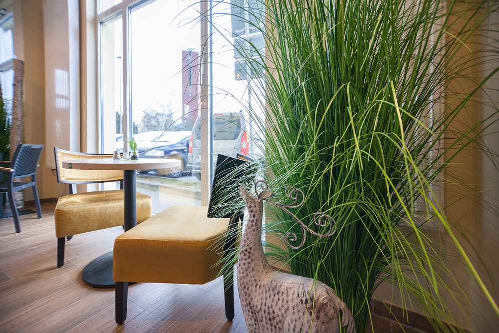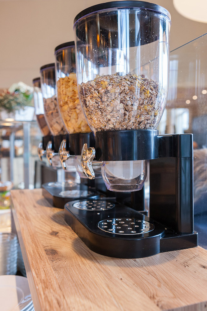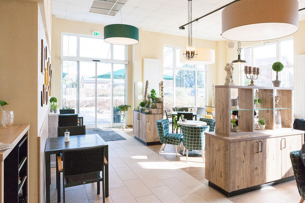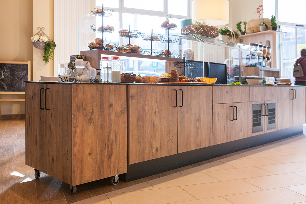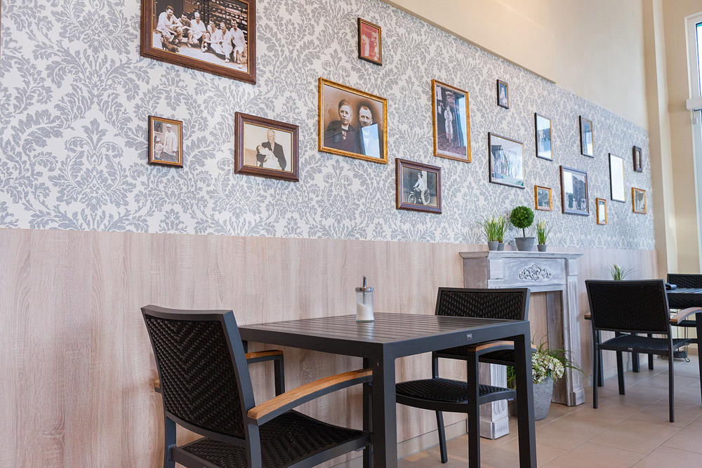 Bei der Gestaltung wurde die Firmenfarbe dunkelgrün mit Holzdekor kombiniert. Die gekonnte Farbkombination verleiht dem Raum eine gemütliche Atmosphäre mit edlem Charakter. Historische Bilder des Bäckermeisters Heinrich Tönjes, dem Gründer der Landbäckerei, spiegeln dabei die langjährige Familientradition wider.