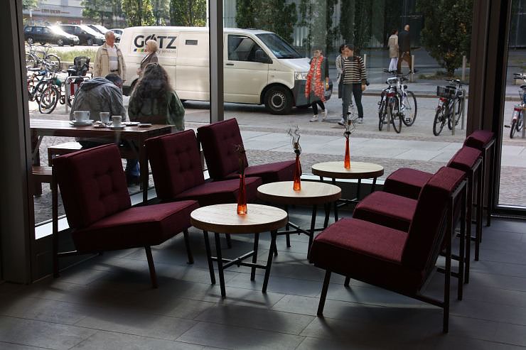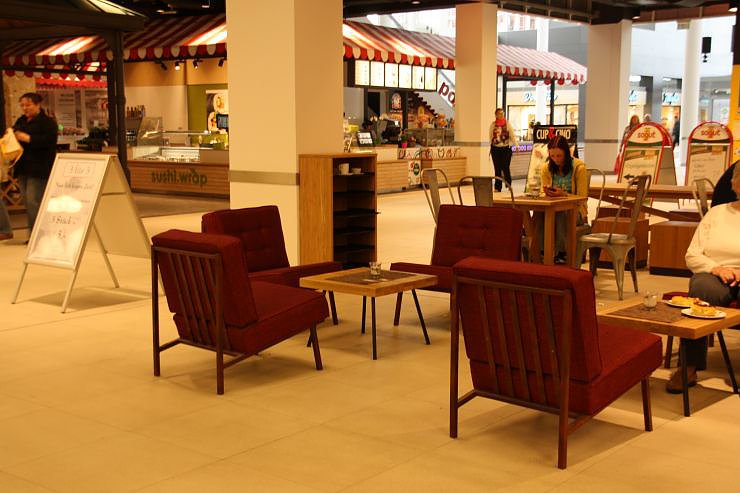Die Verarbeitung von Eichenholz in Spaltoptik in der Thekenfront unterstreicht in Verbindung mit einer Granit-Taschenablage den Charakter der Warenpräsentation. Auch der Loungebereich fängt die Blicke der Gäste ein. Weinrote Designersessel im Retro-Look lassen Gemütlichkeit aufkommen. Ein anderer Teil des Sitzbereiches wird durch ein großes historisches Bild abgerundet. Das Motiv ist schwarz-weiß und zeigt einen Ausschnitt einer Backstube aus früheren Zeiten. Natürlichkeit und Nachhaltigkeit wird durch die mit Kaffeesäcken bezogenen Stühle im Sitzbereich ausgestrahlt.