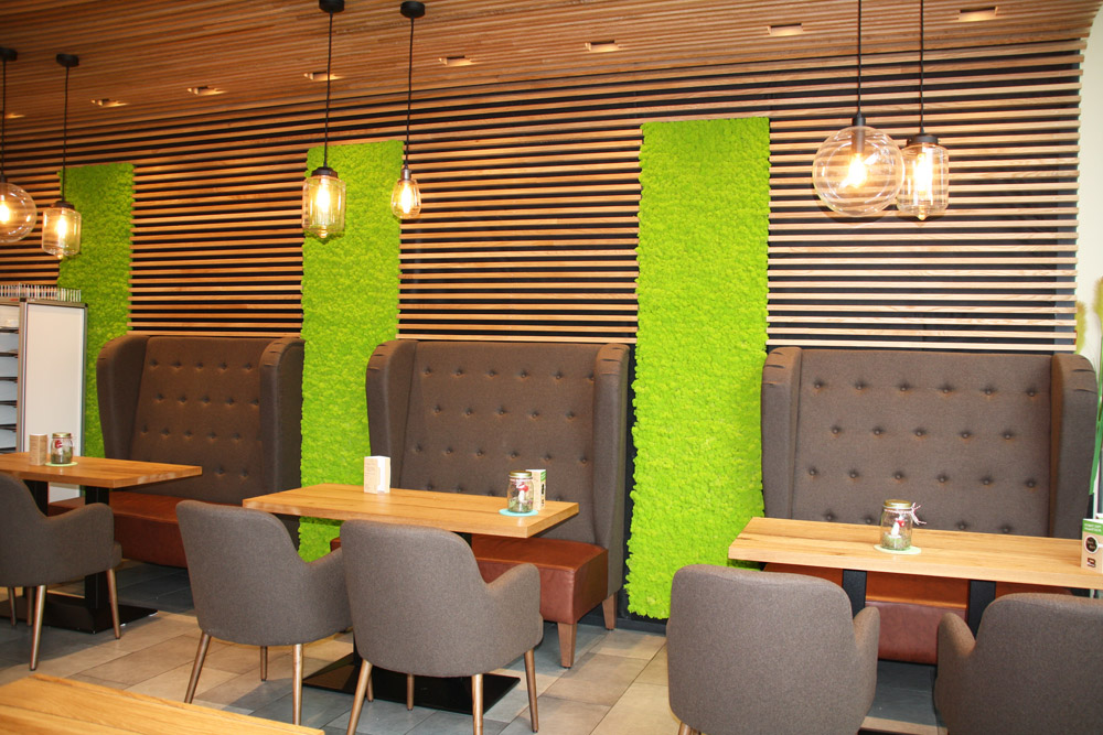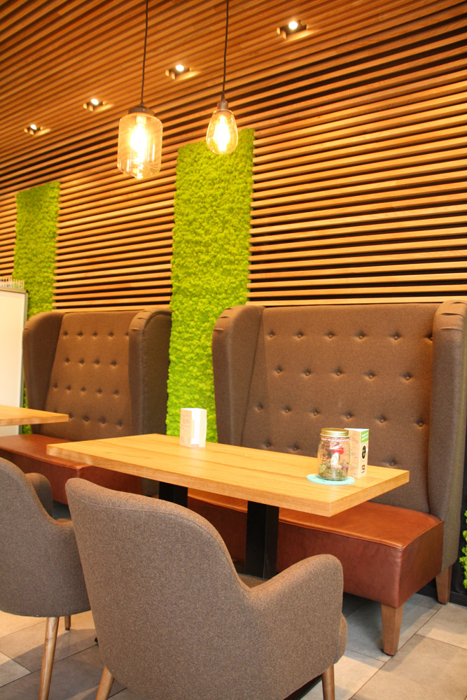 Eine ganz besondere Rolle bei der Schaffung von Gemütlichkeit spielte bei diesem Laden die Gestaltung der Decke. Die vorhandene Decke wurde vollständig demontiert und mit einem neuen System versehen. Die Lamellenoptik aus echten Holzlatten unterstützt die warme Atmosphäre des Sitzbereichs. Die Deckeninstallation schafft einen Anziehungspunkt und gibt dem Raum Struktur. Ein weiteres Highlight der Gestaltung sind die begrünten Wände im Sitzbereich. Dazu wurde echtes Moos verwendet, welches speziell für den Gebrauch in Innenräumen konserviert wurde.