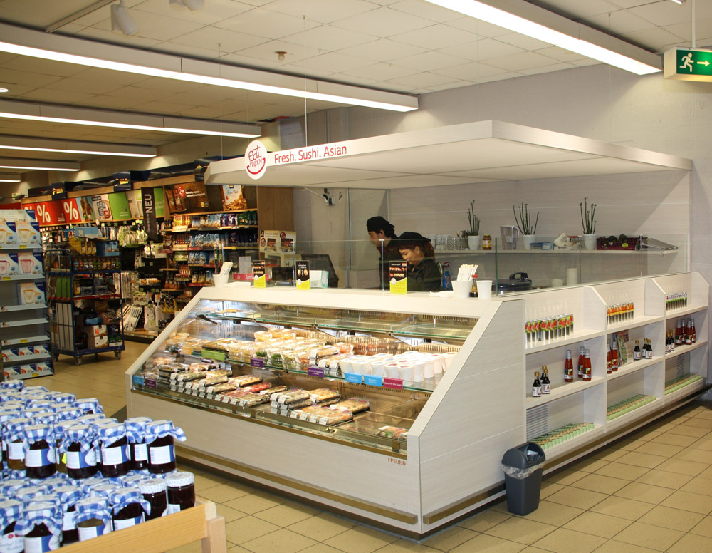 Das Food-Konzept unseres Kunden steht für die leckere, unkomplizierte und überraschende Vielfalt der asiatischen Küche. Die Sushi & Asian Food Bars finden Sie im Lebensmitteleinzelhandel. Vor Ort bereiten die Sushi Köche immer wieder neue Kreationen von Maki, Nigiri oder California Rolls zu. Curries, gebratene Nudeln oder thailändische Suppen. Das Sushi-Bar Shop- in Shop Konzept ist mit einer voll funktionsfähigen Küche ausgestattet, sodass alle Produkte täglich frisch vor den Augen der Kunden zubereitet werden können.