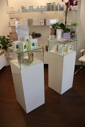 „In Wellnessbereichen will der Mensch zur inneren Ruhe, Entspannung und Besinnung finden.“, so Torsten Eschrich, Projektverantwortlicher und Geschäftsführer von FREUND Ladenbau. Speziell für das Kosemetik-Studio wurde daher ein innovatives Lichtkonzept mit LED-Glasablagen in den Regalen entwickelt. Die Regalsysteme sind weiß Hochglanz lackiert und mit einigen Elementen in Nussbaum kombiniert. So können die hochwertigen Pflegesysteme dem Kunden optimal präsentiert werden.