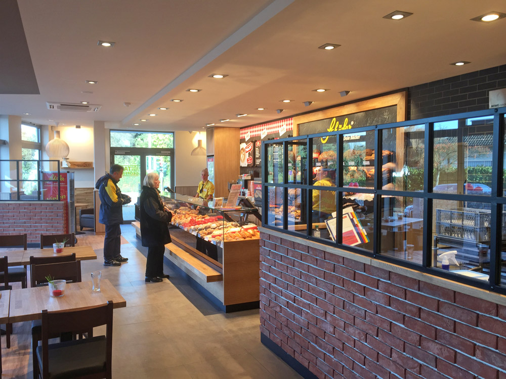 Das funktionale, transparente und einladende Raumkonzept bietet nicht nur ausreichend Platz für das Backen vor Ort und einen gemütlichen Sitzbereich mit großzügiger Warenpräsentation, sondern auch für einen einladenden Außensitzbereich.
