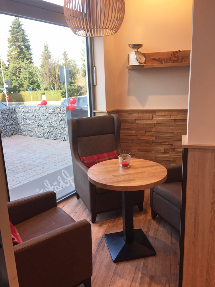 In beiden Filialen wurde Eichenholz eingesetzt, ohne dabei den Raum zu überladen. Der Sitzbereich mit unterschiedlichen Sitzmöbeln und Sitzbezügen setzt farbige Akzente und sorgt für ein warmes Ambiente. Die Wandelemente aus verputztem Backstein verbinden in besonderer Weise Tradition und Moderne. Backstein prägt das Bild von Dauerhaftigkeit und verstärkt durch seinen besonderen Charme das Gefühl von Gemütlichkeit.