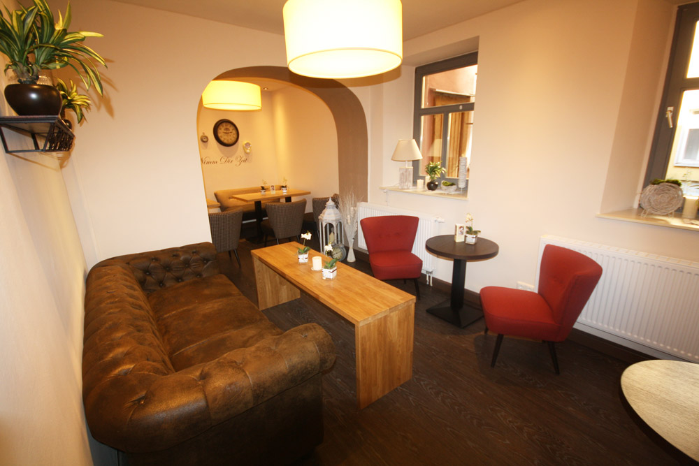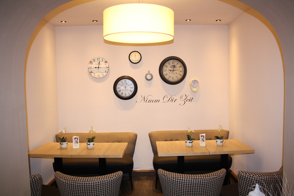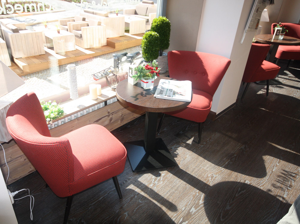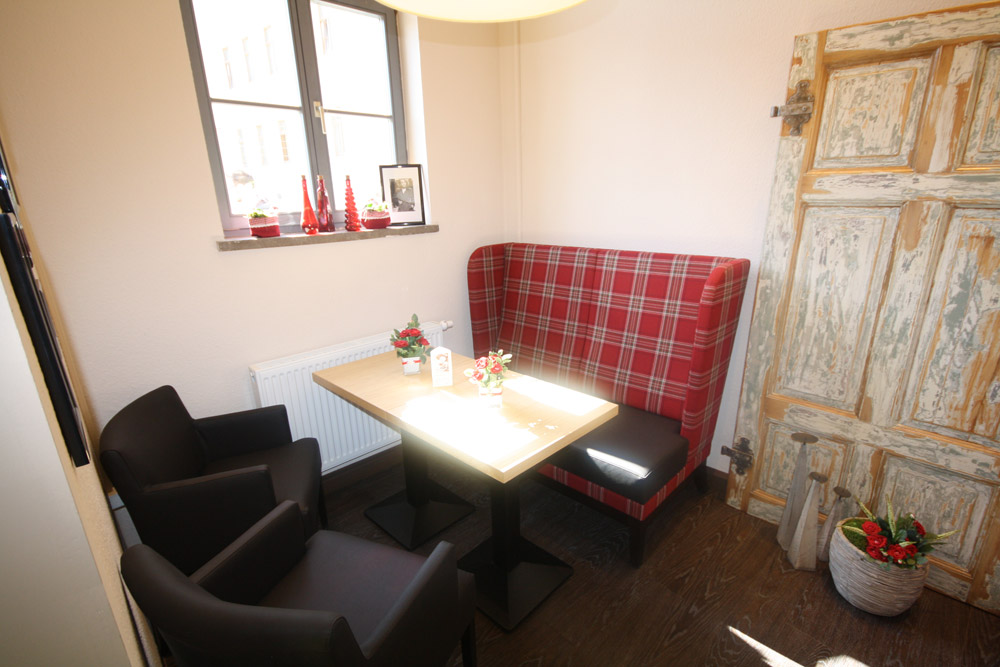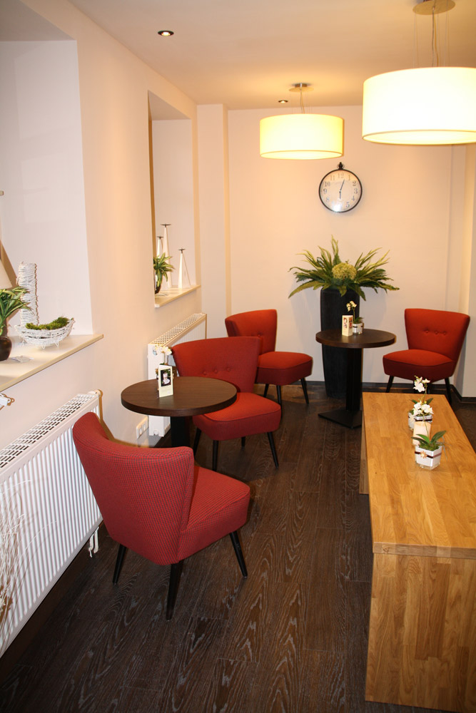 Der kreative Umgang mit den unterschiedlichen Räumen des Objektes, führte zu differenzierten Erlebniswelten für den Kunden. Die gemütlichen Ohrensesselbänke im vorderen Raum schaffen eine Wohlfühlatmosphäre der besonderen Art und laden Besucher ein, bei einem Stück Kuchen und einem frisch zubereiteten Espresso zu verweilen.