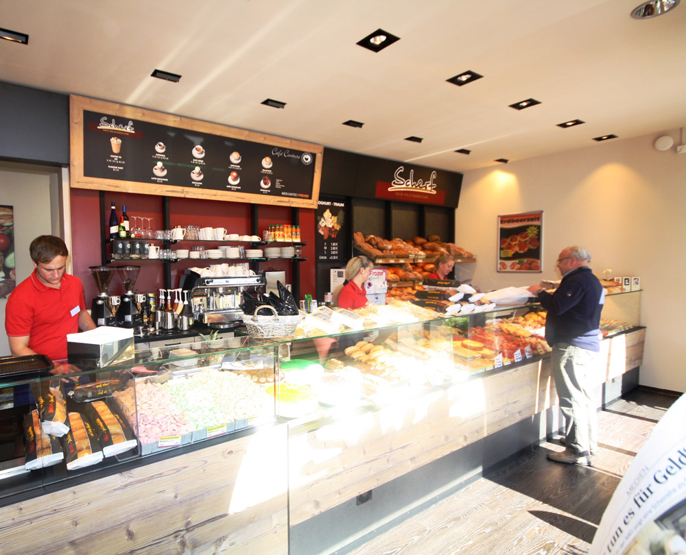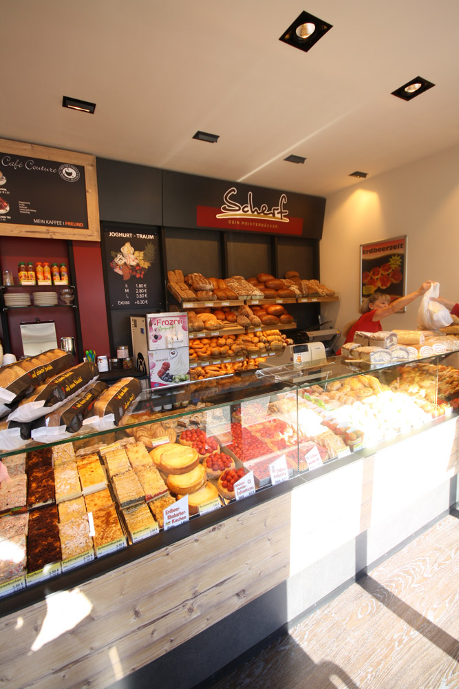 Bereits der offen und hell gestaltete Eingangsbereich mit großen Fensterelementen motiviert die Kundeninnen und Kunden einzutreten in eine besondere Bäcker-Filiale. Die geschmackvolle Warenpräsentation in einer hochwertigen Verkaufstheke schafft Übersichtlichkeit und Orientierung. Viel Holz in unterschiedlichen Farbtönen erzeugt ein warmes Ambiente, in dem sich Kunden und Mitarbeiter wohlfühlen. Der zur Verfügung stehende Platz wurde perfekt ausgenutzt.