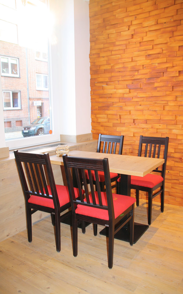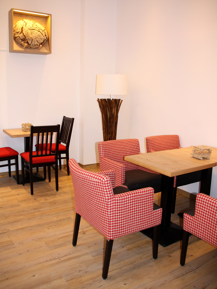 Der gemütlich gestaltete Sitzbereich der neuen Filiale lädt zum Verweilen und Wohlfühlen ein. Eine hochwertige Bestuhlung, mit bequemen und edlen Stoffen, sorgt zusammen mit farblich passenden Stoffpendelleuchten für eine entspannte Atmosphäre. Besonders in Szene gesetzt wird der Sitzbereich durch kleine, an den Wänden montierte, Regale mit den Brot-Meisterstücken der Bäckerei, die jedem Kunden der hier verweilt zeigen, welche Qualität und Hingabe nicht nur bei dieser Bäckerei, sondern auch bei dieser neuen Filiale im hohen Norden täglich Programm ist. Ein besonderer Lieblingsplatz vieler Gäste ist die Ohrensesselgruppe gleich zu Beginn des Sitzbereichs.