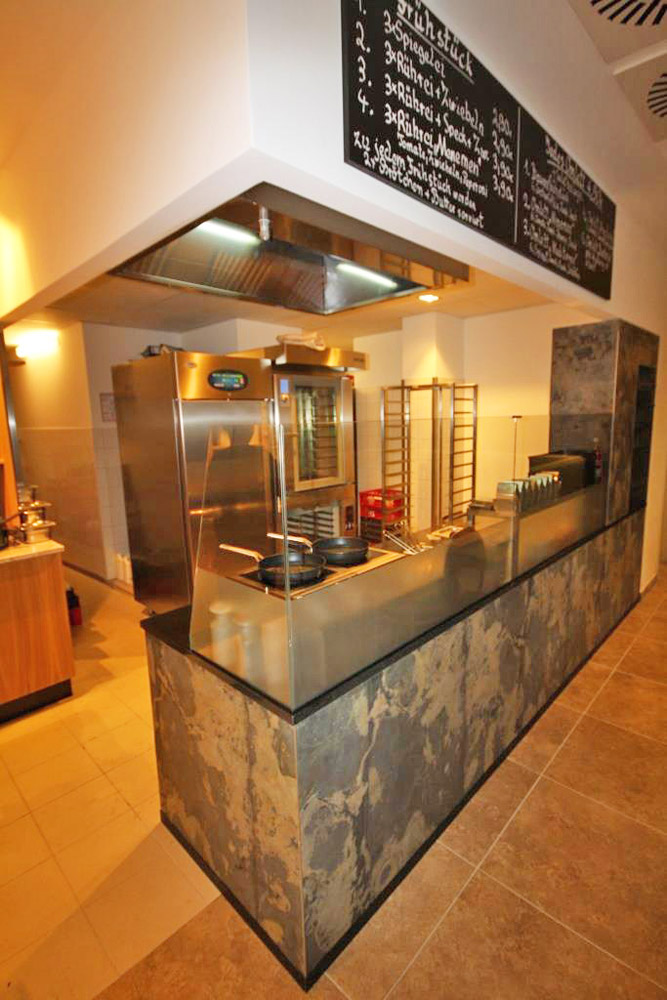An der Kochstation, welche mit echtem Schiefer verkleidet ist wird von morgens bis abends vor den Augen der Kunden vorbereitet und gekocht – so wird echte Frische lebendig. Spaghetti, Penne, Penne Tricolor, Bandnudeln, Vollkorn-Penne, Tortellini, – und alles kombinierbar mit den frisch vorm Kunden zubereiteten köstlichen Soßen wie-Tomaten Rahm-Soße, Arrabiata, Bolognese, Gorgonzola, Carbonara oder auch einfach mit frischem Pesto.