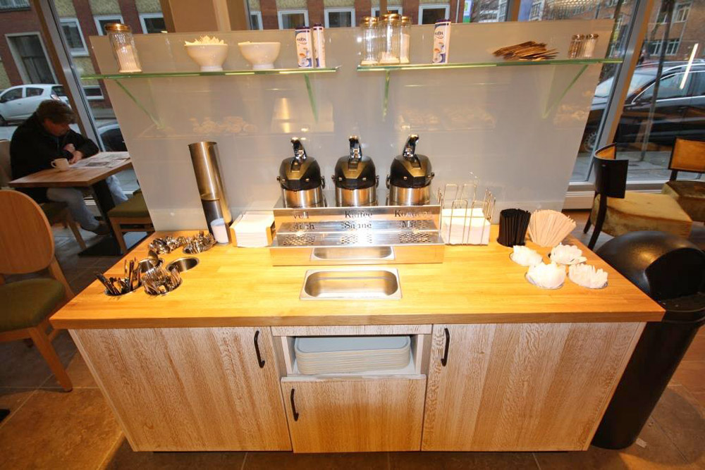 Verschiedene Materialien – wie z.B. Eiche weiß gekalkt, Samtstoff, echter Schiefer, Villeroy und Boch Fliesen – aber auch die Wandverkleidung in Spaltholz schwarz lasiert flossen zunächst in die gestalterischen Grundüberlegungen und dann in die Umsetzung ´ein. Eine Besonderheit der Thekenkonstruktion ist die Neigung des Glasaufsatzes in Richtung des Kunden. So kann eine optimale Warenpräsentation ermöglicht werden und der Kunde hat von oben einen wunderbaren Blick auf die angebotenen Backwaren.