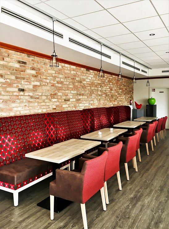 Neu gestaltet wurde der gesamte Innenraum des Sportzentrums, einschließlich Check-in, Café- und Ausschanktheke sowie Sitzbereich. Die Einrichtung wurde modern und in warmen Farben gestaltet, um eine gemütliche und heimelige Atmosphäre zu schaffen, in der sich die Sportler nach ihrem Training erholen und Feste gefeiert werden können.