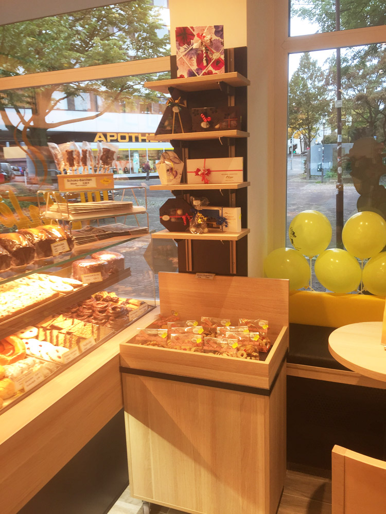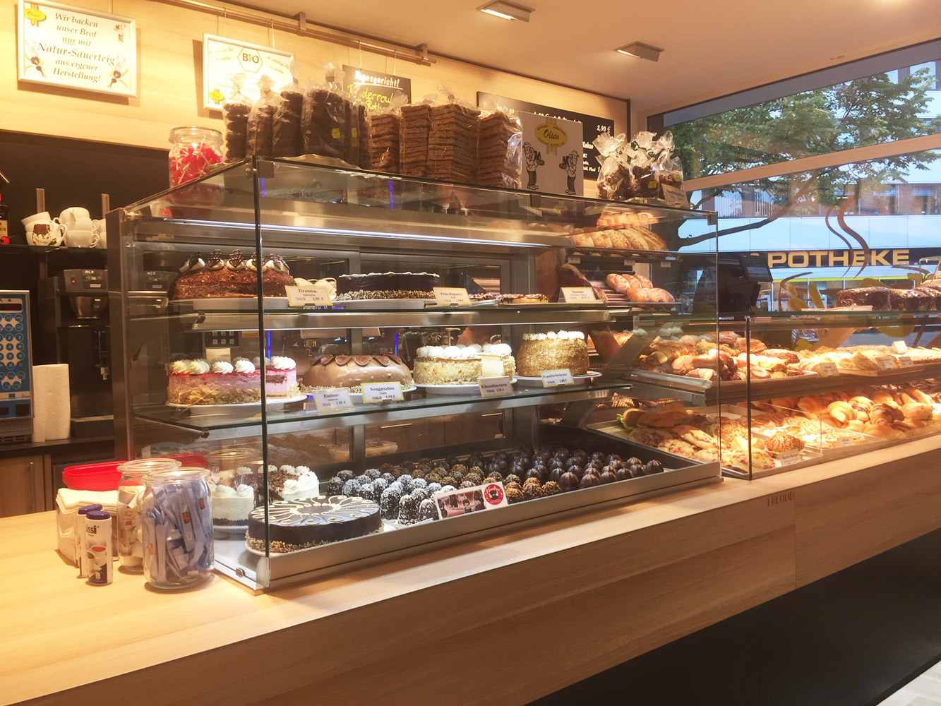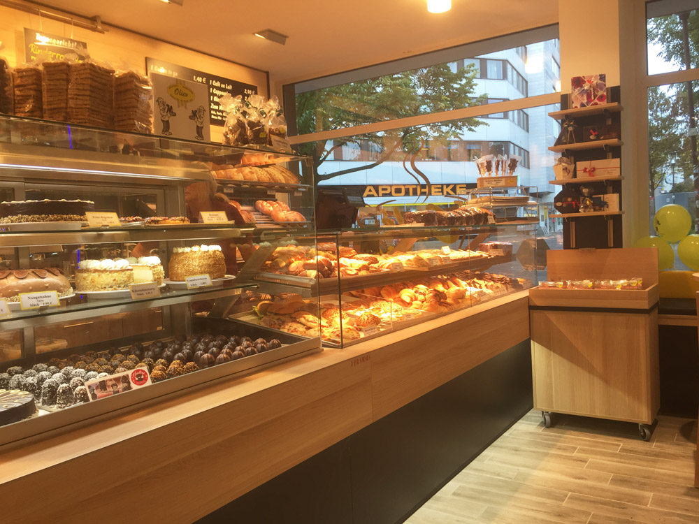 Der zunehmende Fokus auf Inhaus-Verzehr erforderte sowohl einen größeren Sitzbereich als auch ein erweitertes Snack- und Mittagstischangebot. Diese Weiterentwicklung des Verkaufskonzeptes bedingt auch eine Weiterentwicklung des Ladenkonzepts. Mit dem neuen Ladenbaukonzept sollte sowohl das traditionelle Publikum erhalten bleiben, als auch weitere Kundengruppen hinzugewonnen werden. Gelungen ist dies durch eine moderne Gestaltung und ein erweitertes Angebotskonzept, das trotz allem Wert auf Tradition legt. So bleibt das traditionelle Gebäck, die feinen Konditorwaren, wie auch die handgemachten Pralinen sowie Brot- und Brötchenspezialitäten aus eigener Fertigung selbstverständlich im Bestand. Gebacken werden sie ganz frisch im Steinplattenofen vor Ort. Ins rechte Licht gerückt werden die selbstgemachten Torten und Pralinen nun in der dominierend gestalteten Counterumluftkühlung.