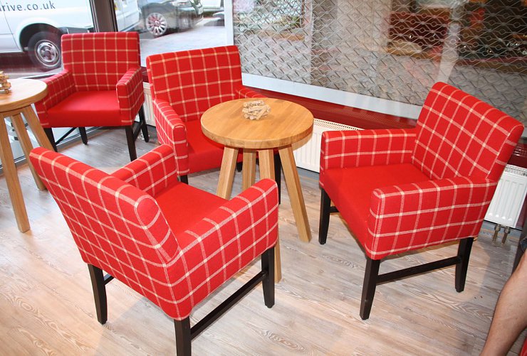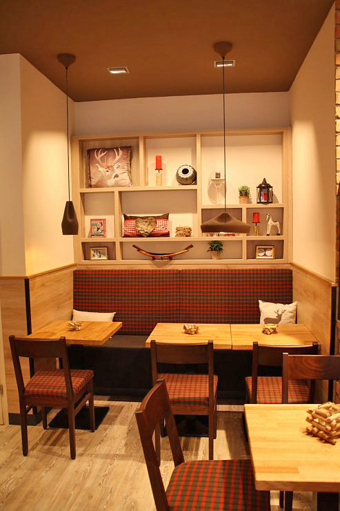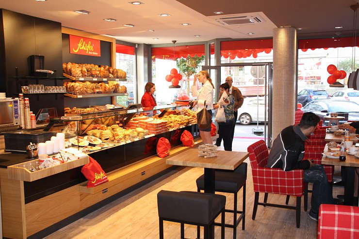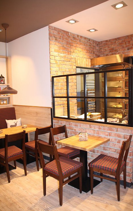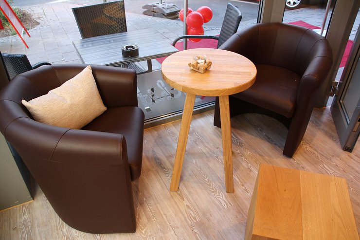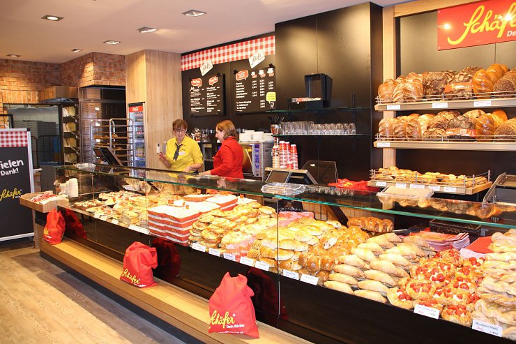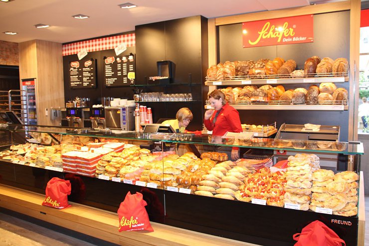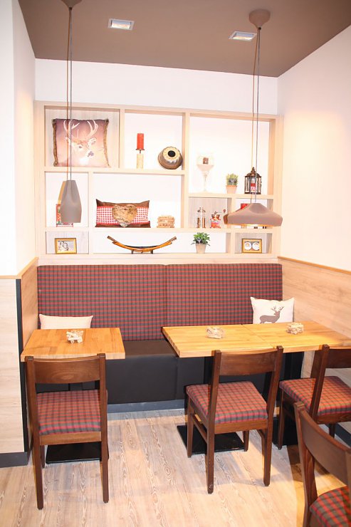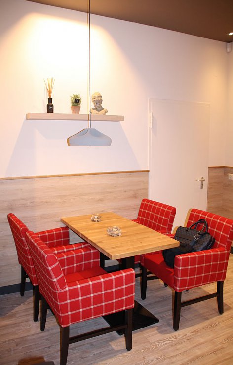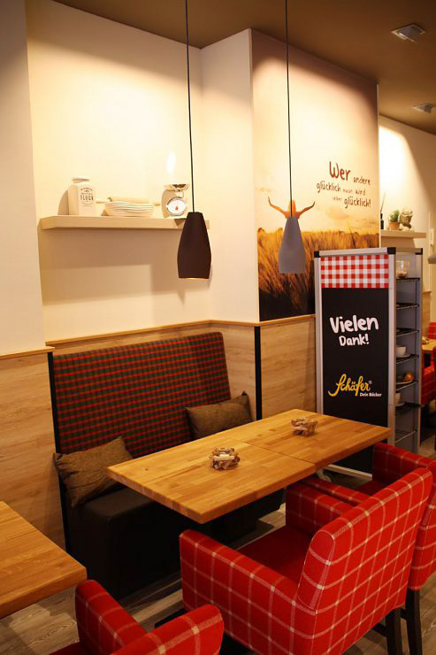 Die frischen Backwaren, die warmen Holztöne und die Akzentfarbe „Rot“ – Teil des Corporate Designs– zaubern ein angenehmes Raumgefühl.